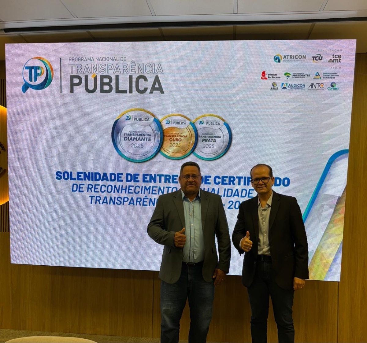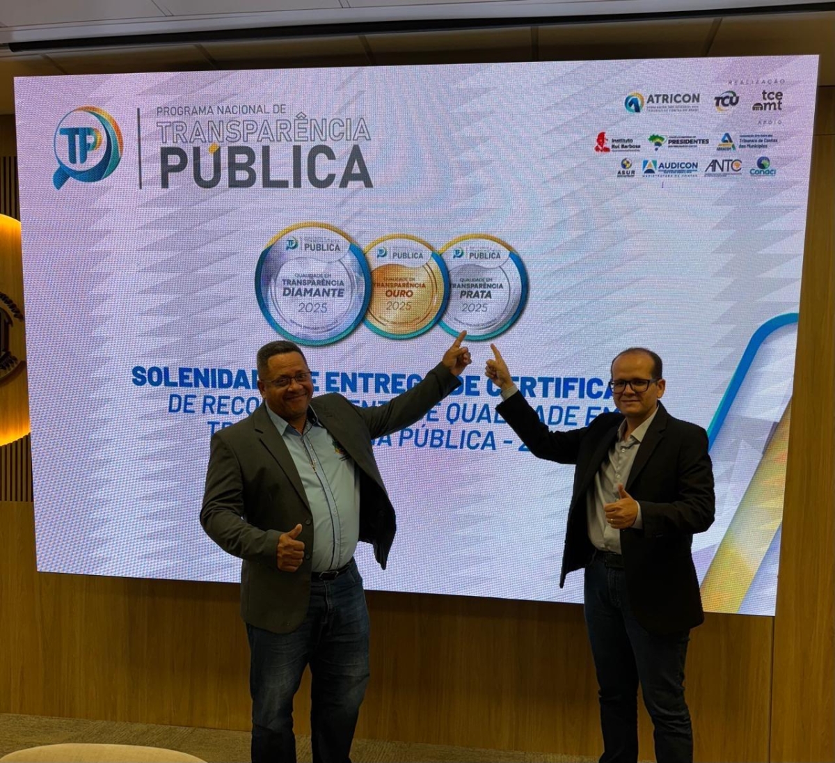Quarta-feira, 10/12, o presidente da Câmara Municipal, Valmir Leite, juntamente com o prefeito Jefferson Souto, estiveram em Cuiabá, no TCE-MT, para receber o Certificado de Selo Prata de Transparência Pública.